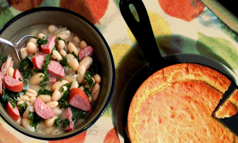 Heat about 2 T olive oil in your kettle. Add the onion and saute until soft. Throw in your sausage and continue to saute for 2-5 minutes, depending on how long you’re willing to stand there.  Add kale, in batches if necessary, and toss until it wilts.  Add beans and broth and bring to a simmer.  At this point, it’s ready to eat, but I like to simmer for at least an hour so all the flavors blend together and the beans and onion are really, really soft.