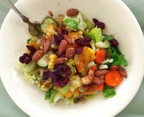 I’m having it for lunch today on a bed of balsamic-dressed romaine with dried cranberries and almonds (and one wandering cashew).