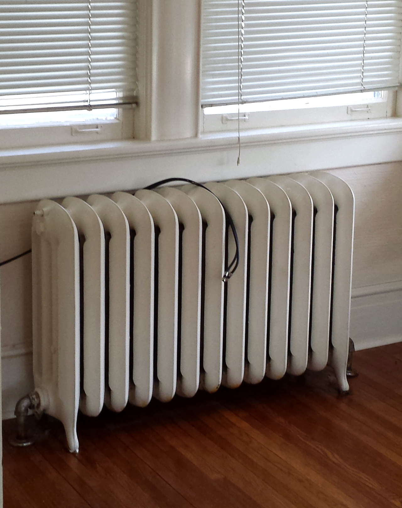 Yep, that’s a window. The left of frame is the door jamb. My place has this beautiful curved 4″ moulding throughout. What’s in place there is a tension rod braced against glazed ceramic tile. So guess what happens when you hang a towel on the rod or pull the shower curtain closed too vigorously?
