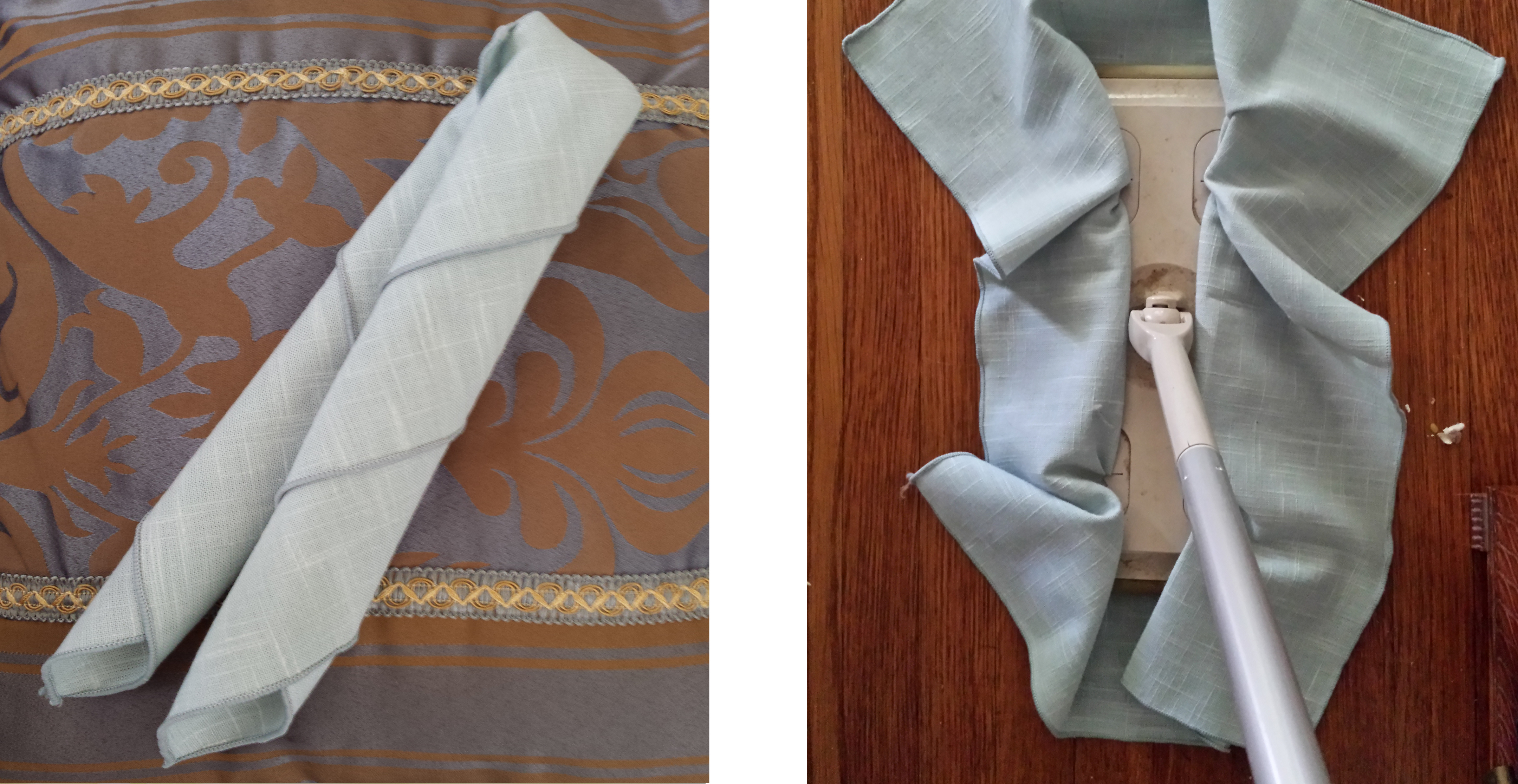 Man, those things are dust havens. Enter my old Swiffer stick. But no Swiffer pads, just old linen napkins that I was about to give to charity. They work just fine.